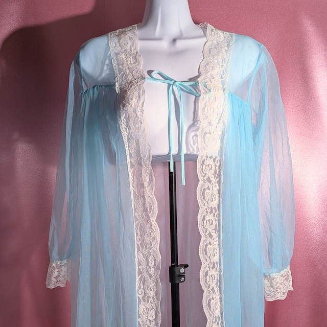 -     Sears 水色×レースナイトガウン 60s-70s USA製ヴィンテージ ¥8,500 淡い水色にレースのディテールが目を引く、魅惑のヴィンテージナイトガウンです。 レトロな優雅さが漂うデザインで、どんなコーディネートにもさらりと羽織って着回すことができます。 着丈:90cm 肩幅:35cm 袖丈:35cm
