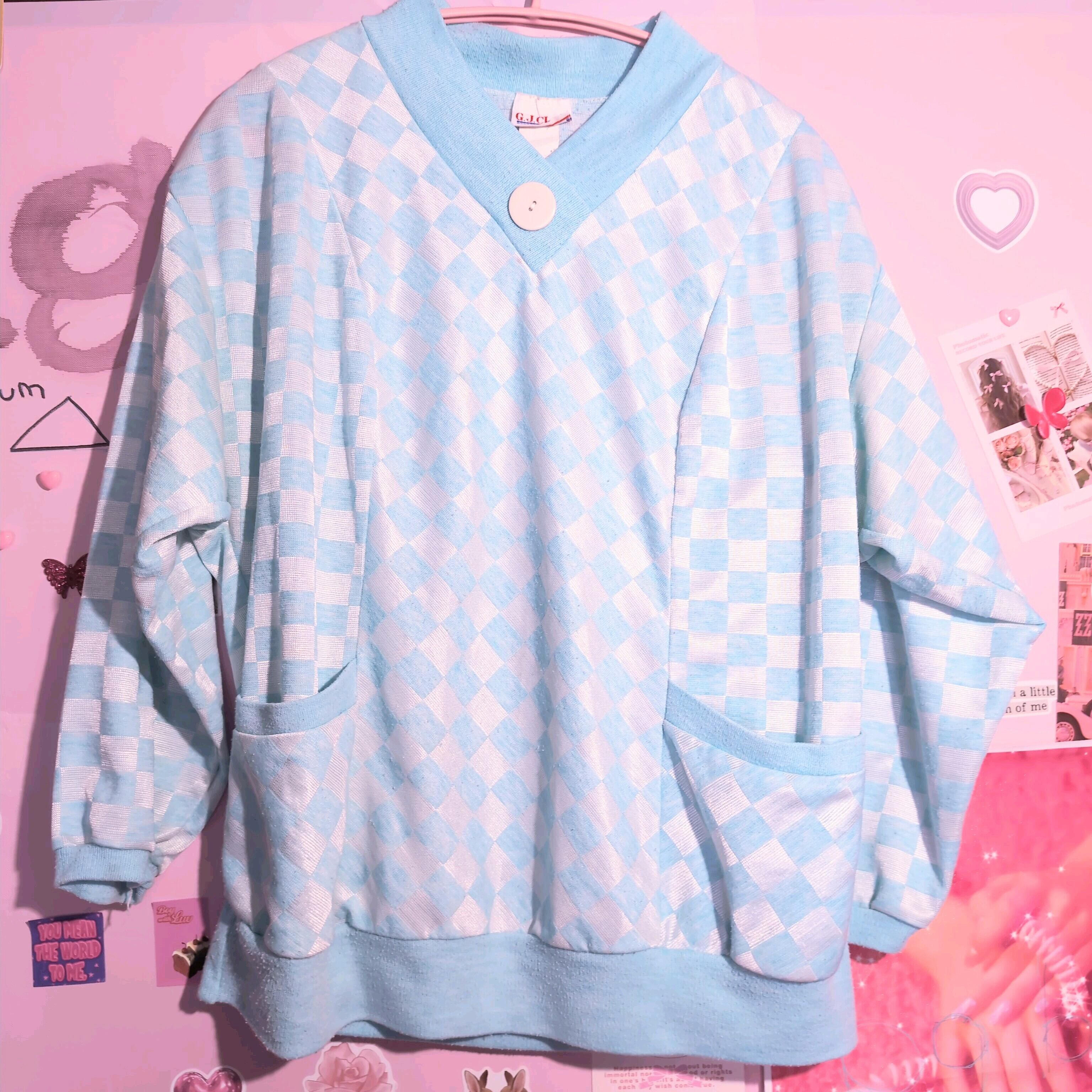 少し光沢感のある生地で水色の格子柄が爽やか。