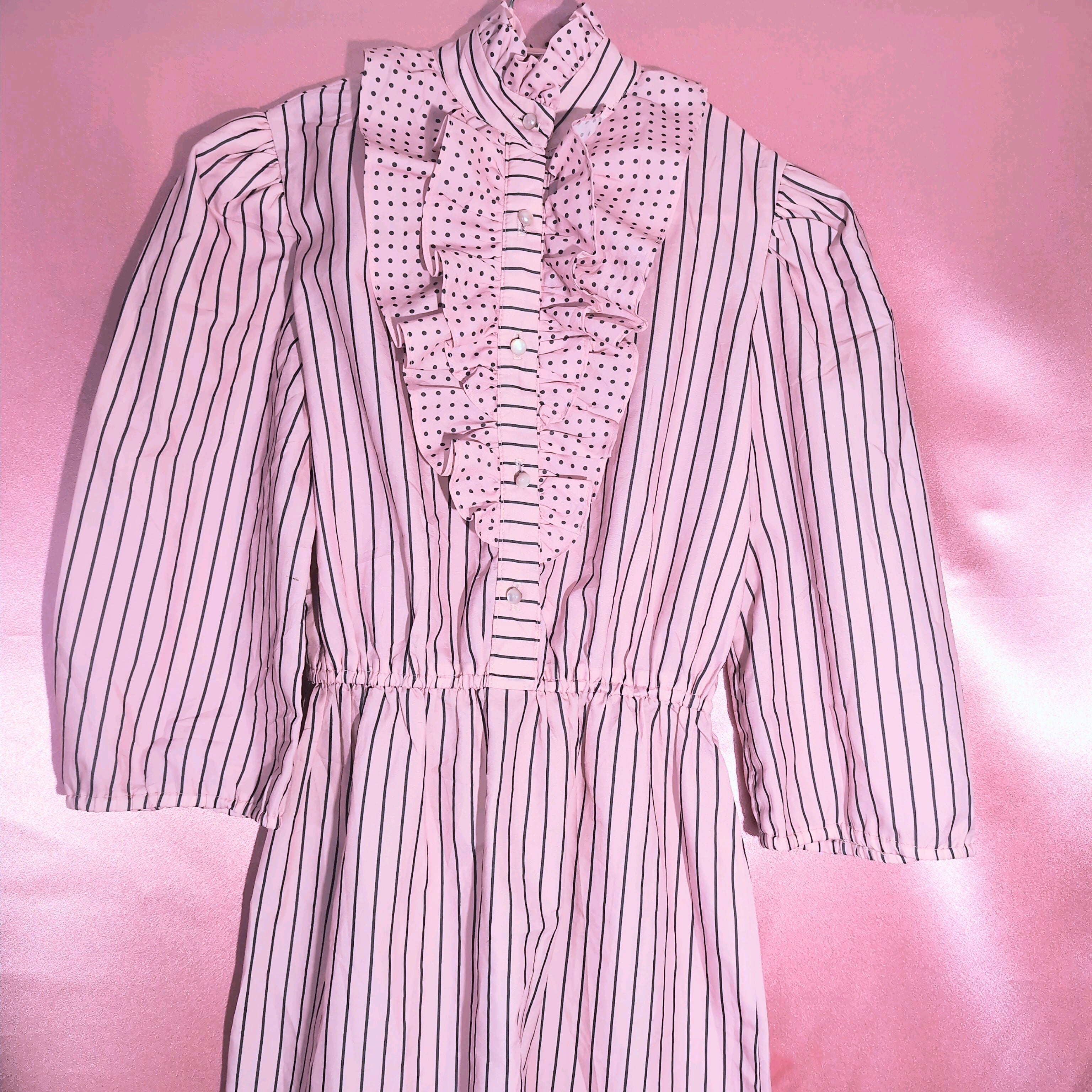 ピンク ストライプ×ドット柄 ロング丈ワンピース 海外ヴィンテージ