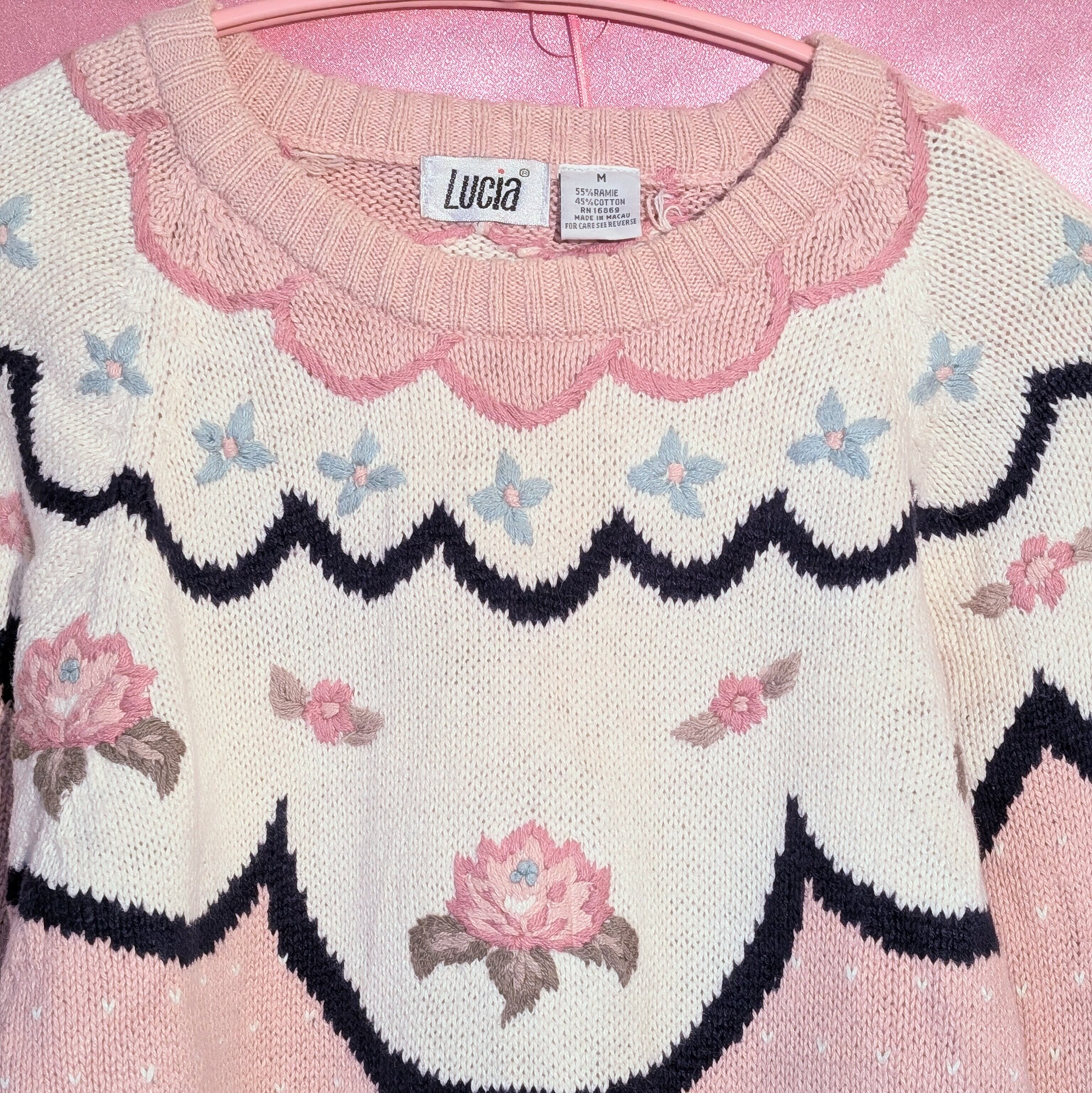 お花の刺繍がいっぱいの、ほっこりした印象のニットです。胸元のふりふり模様はグルっと後ろまで続いてて可愛い。