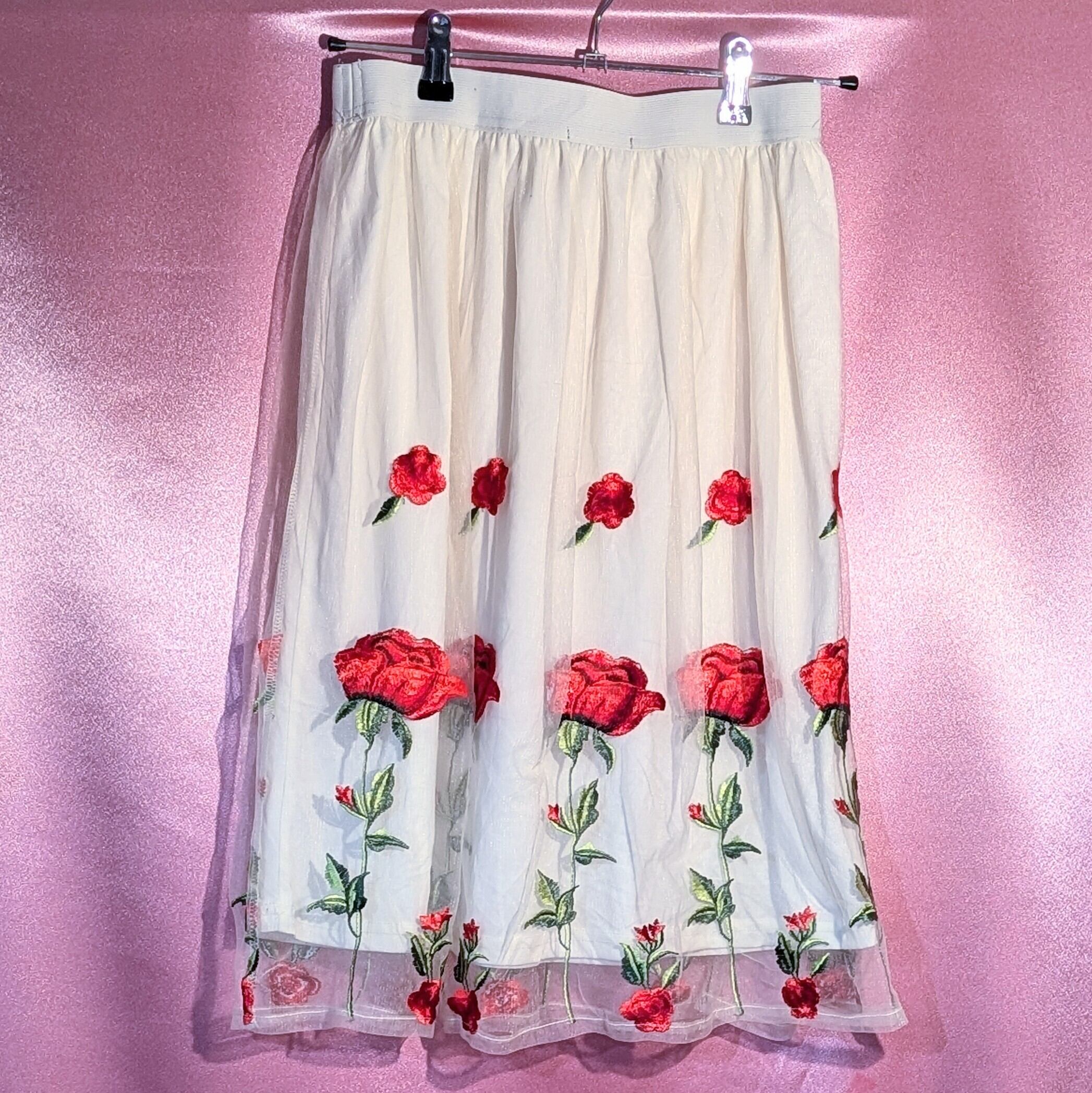 上品で華やかな薔薇刺繍が施されたレースデザインが特徴のスカートです。