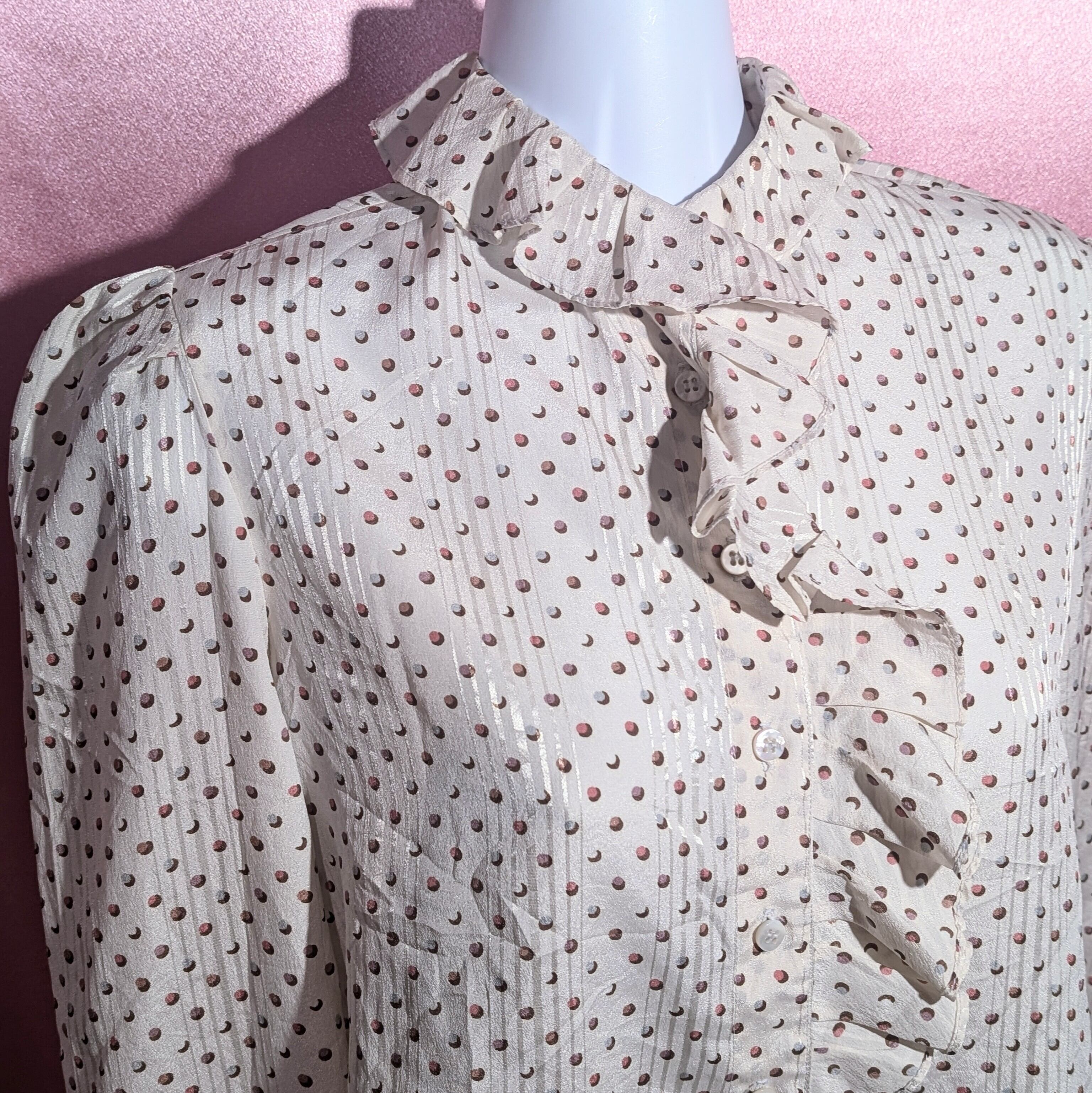 上品なドット柄とフリルデザインが魅力的で、80sレトロの雰囲気を感じさせるアイテムです。