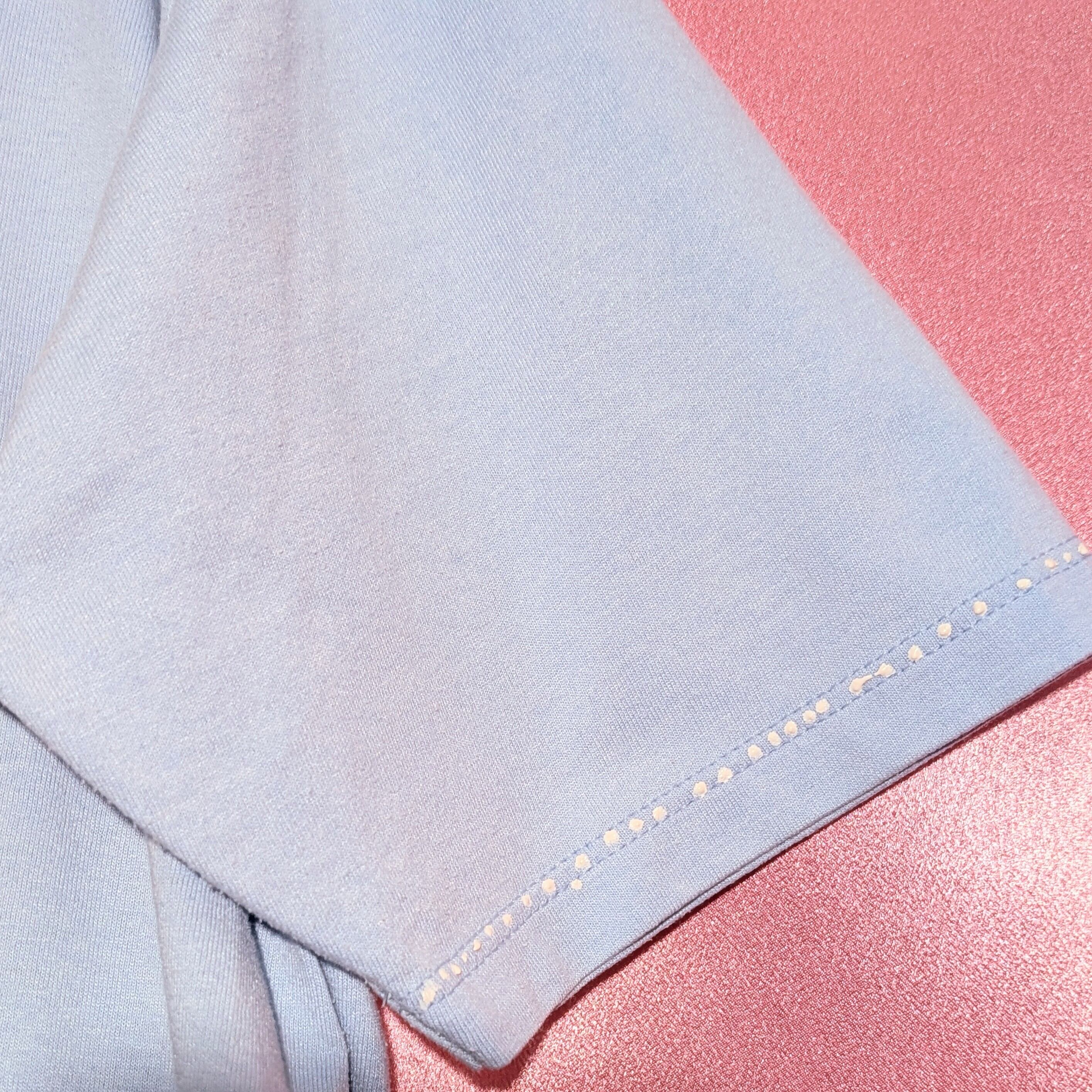 首元や袖周り、イラスト周囲の白のドットは手描きで、ポコポコと立体的なインクです。また、くまちゃんイラストのラメ部分も手描きです。
