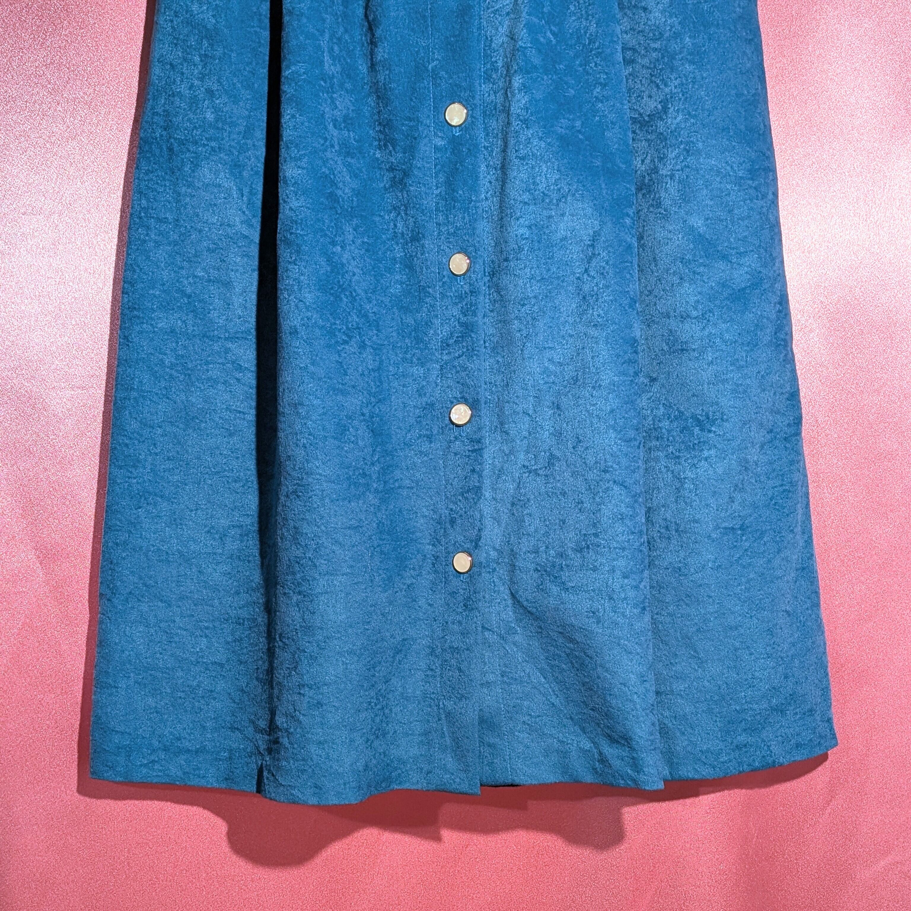 生地はしっとりと吸い付くような手触り。センターに並ぶボタンはひとつひとつがシルバーに包まれた貝ボタン。ブルーの生地に際立って存在感があります。