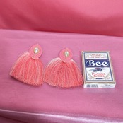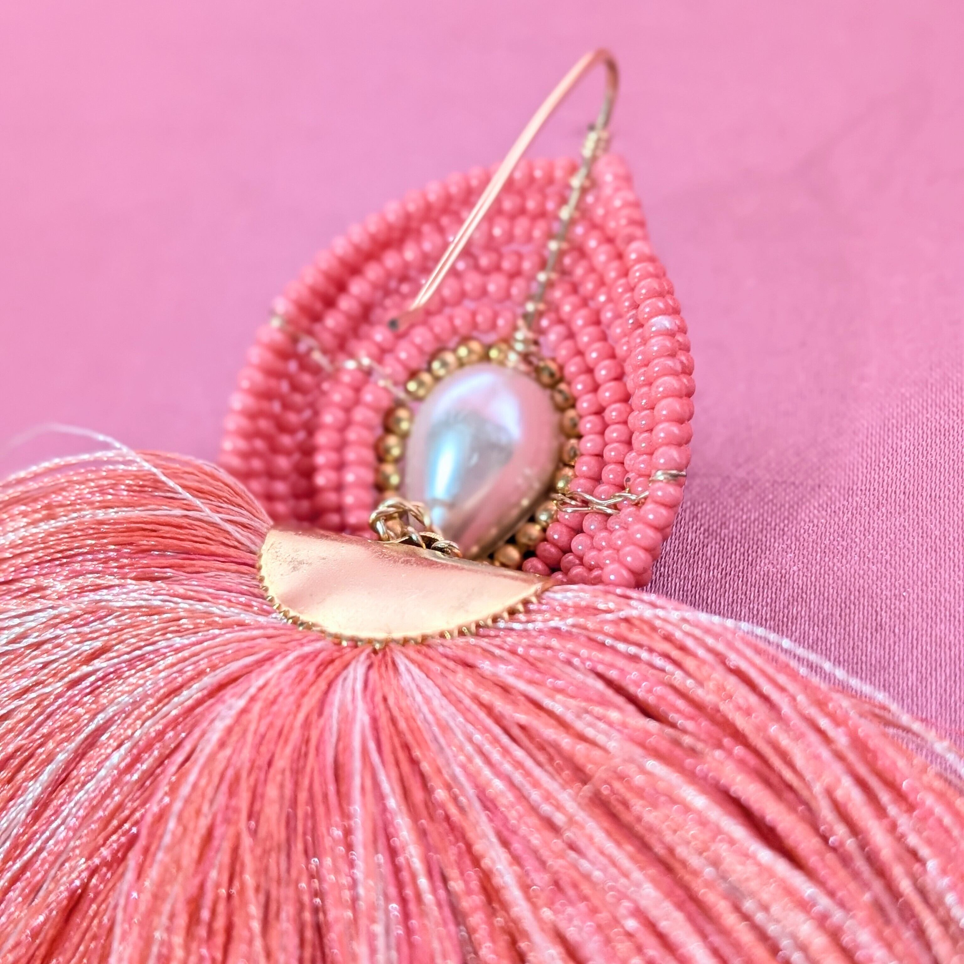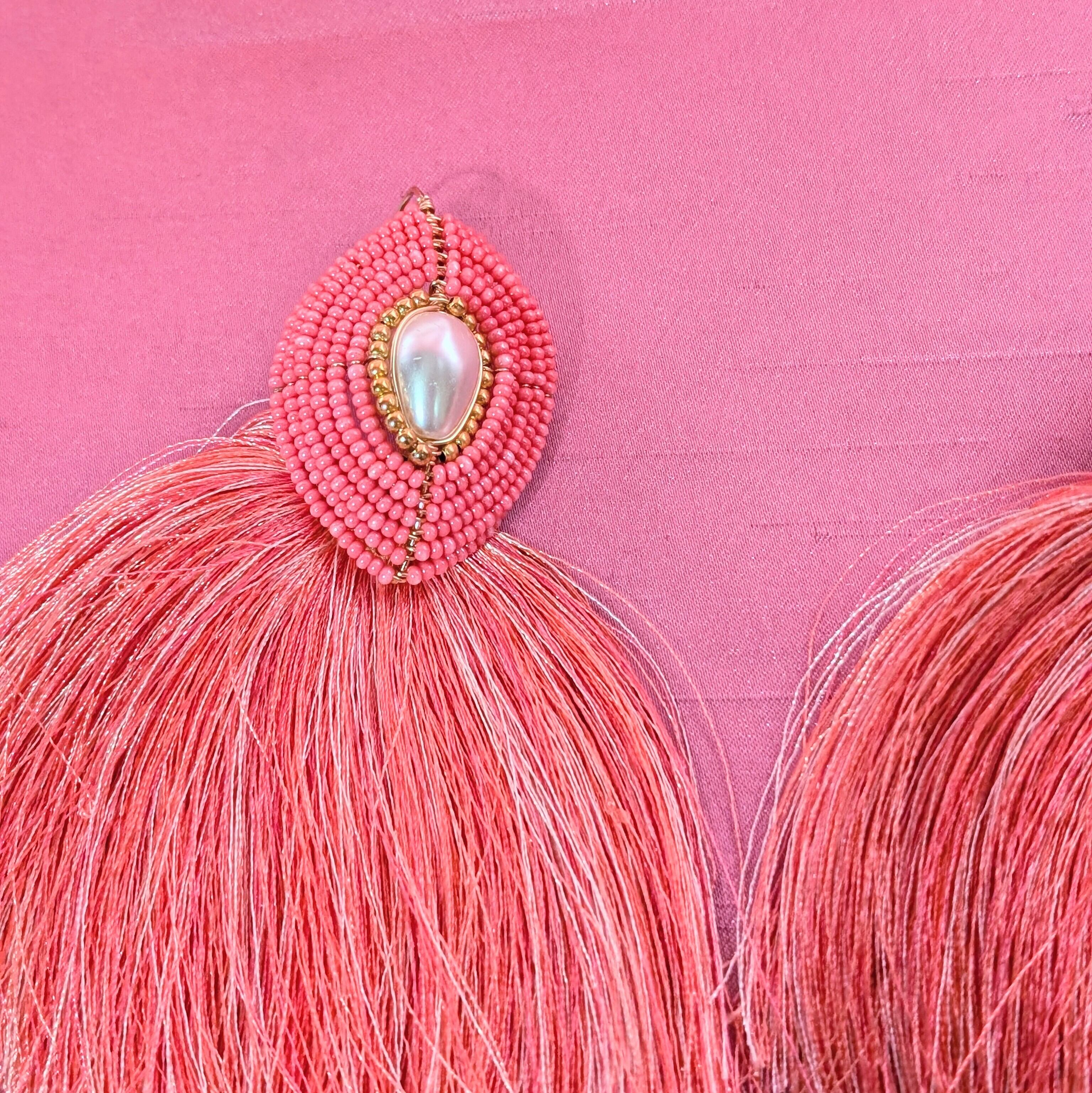 コーラルピンクのビッグなフリンジが華やかなピアスです。